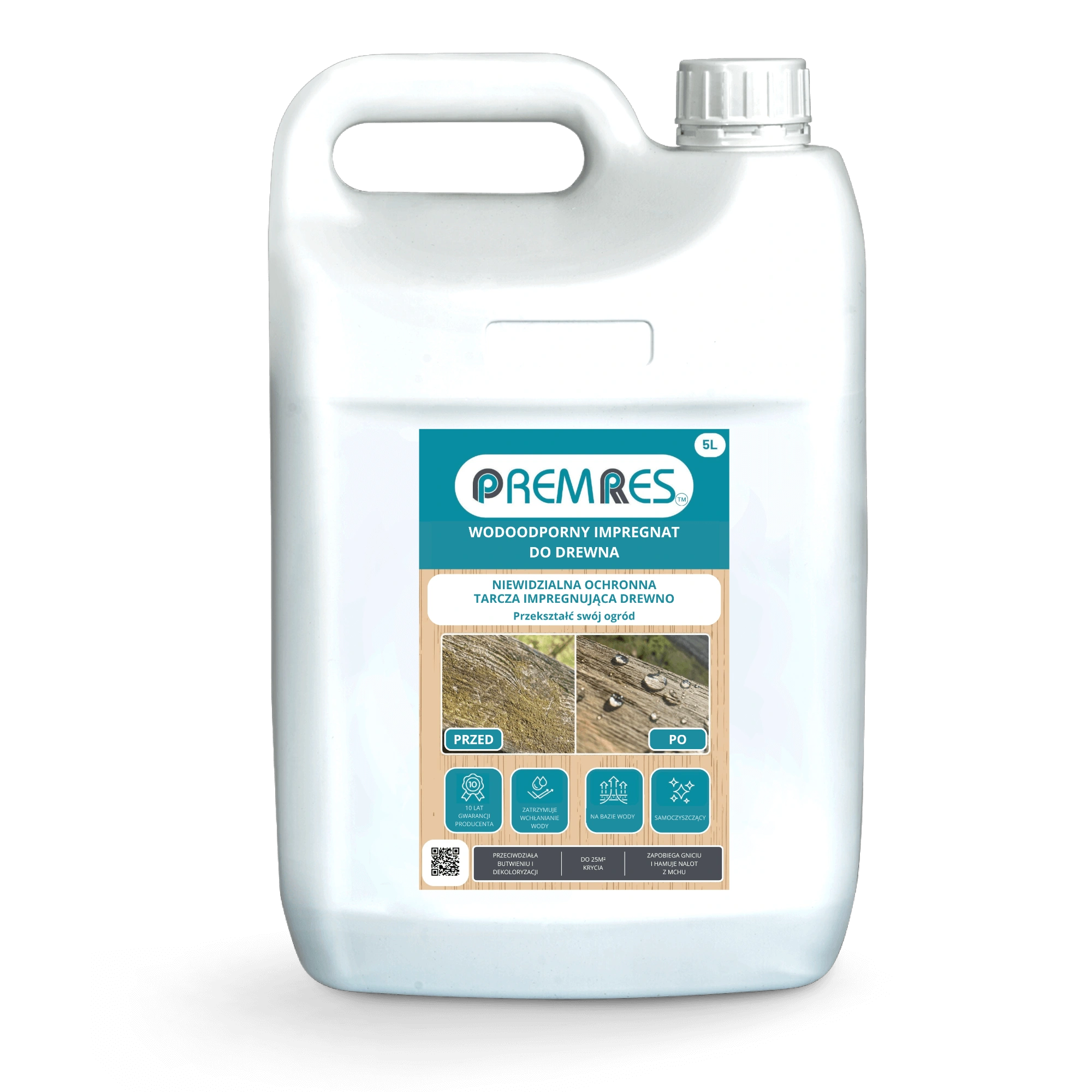 PremRes Wodoodporny Impregnat do drewna to wodny, niewidoczny środek hydroizolacyjny do drewna. Został zaprojektowany, aby zapobiegać absorpcji wody przez odpychanie wody, co powoduje, że tworzą się kropelki, ponieważ woda jest bardziej przyciągana do siebie niż do powierzchni pokrytej środkiem. To z kolei pomaga chronić drewno przed uszkodzeniami i rozkładem. Jest przeznaczony do stosowania na wszystkich pionowych, surowych powierzchniach drewnianych, takich jak ogrodzenia drewniane, domki z bali, drewniane bramy, zewnętrzne belki drewniane i drewniane fasady.